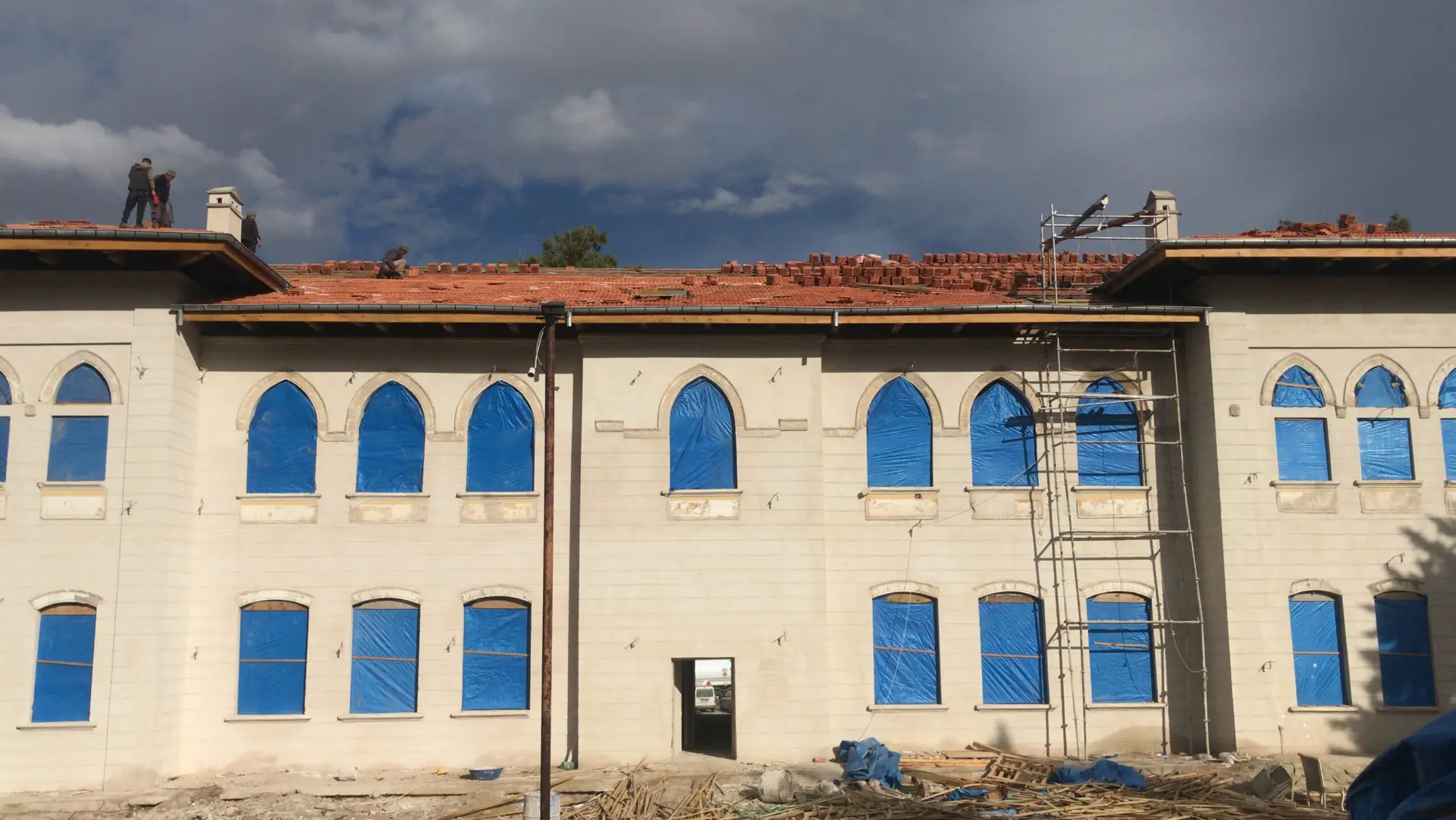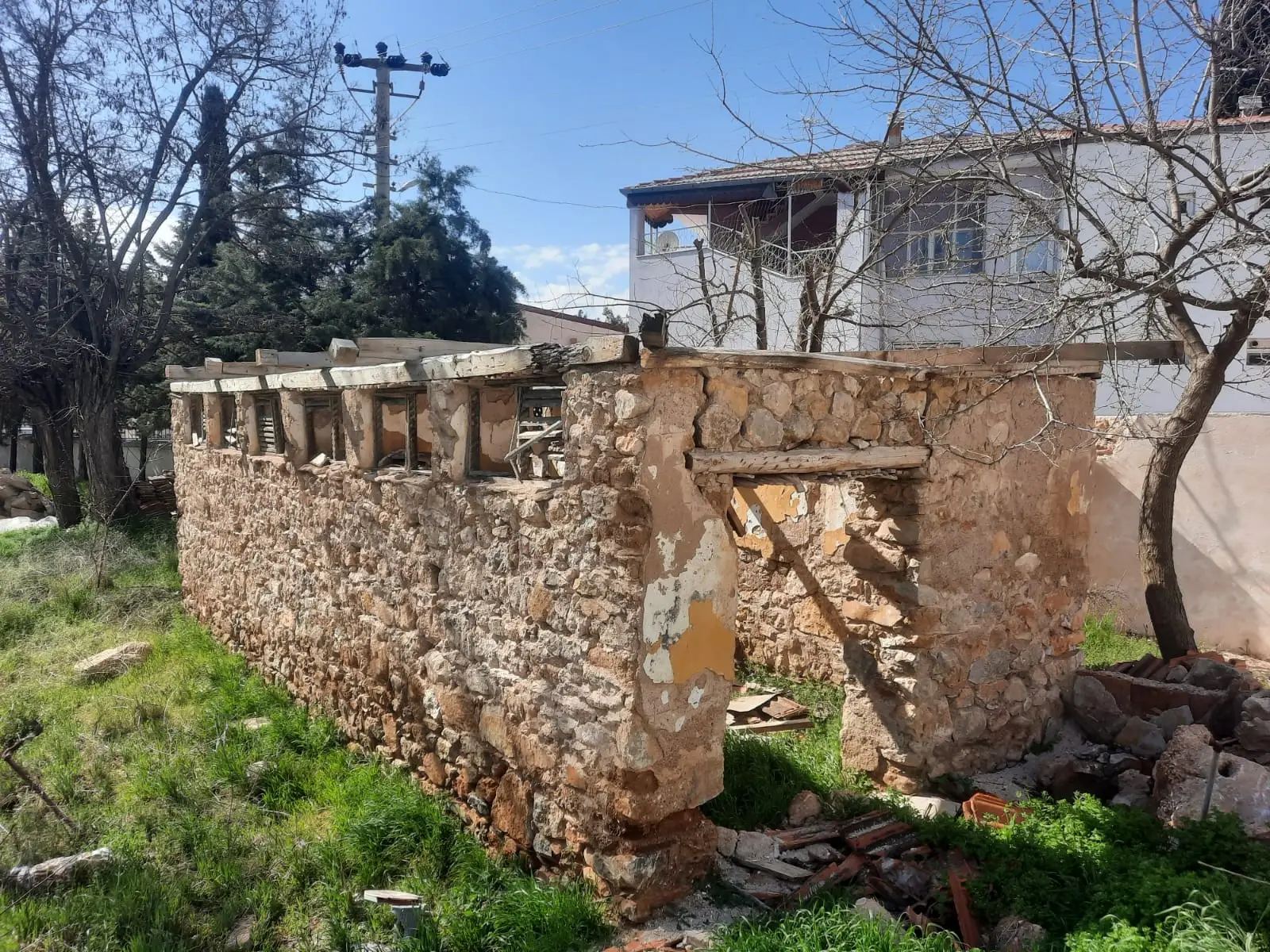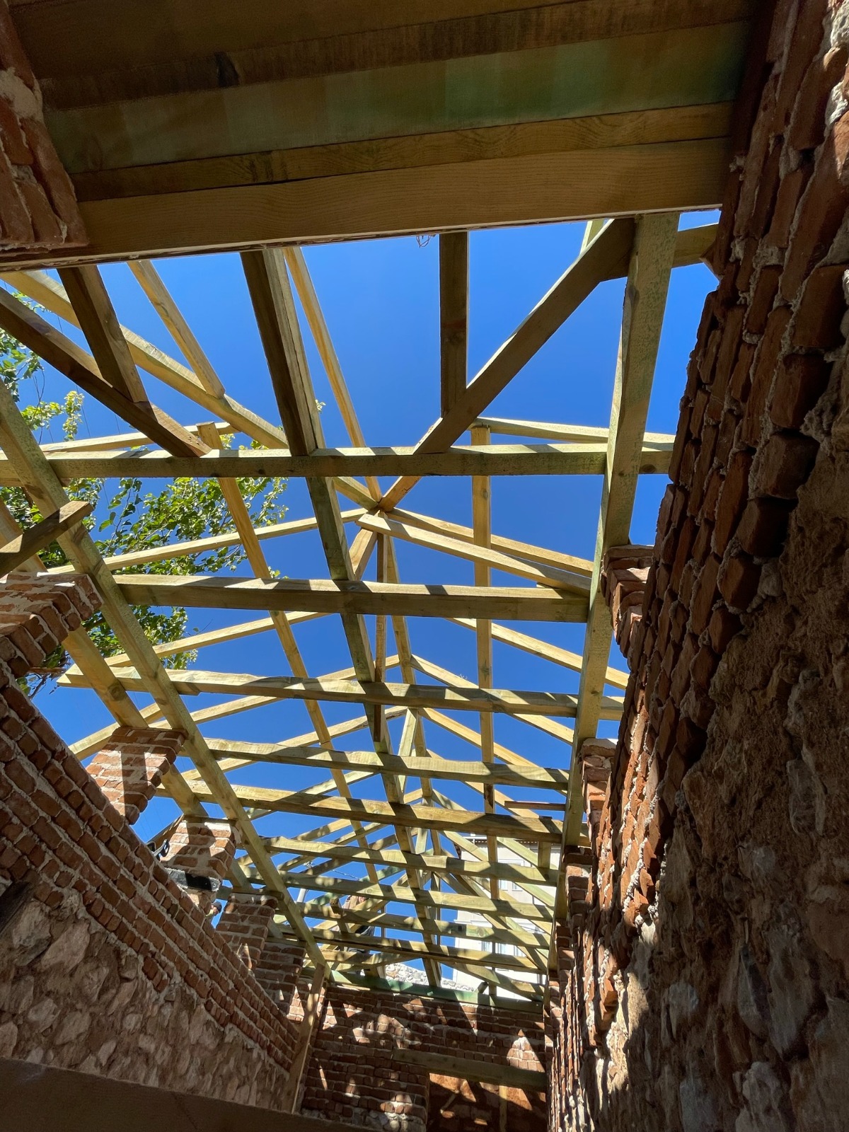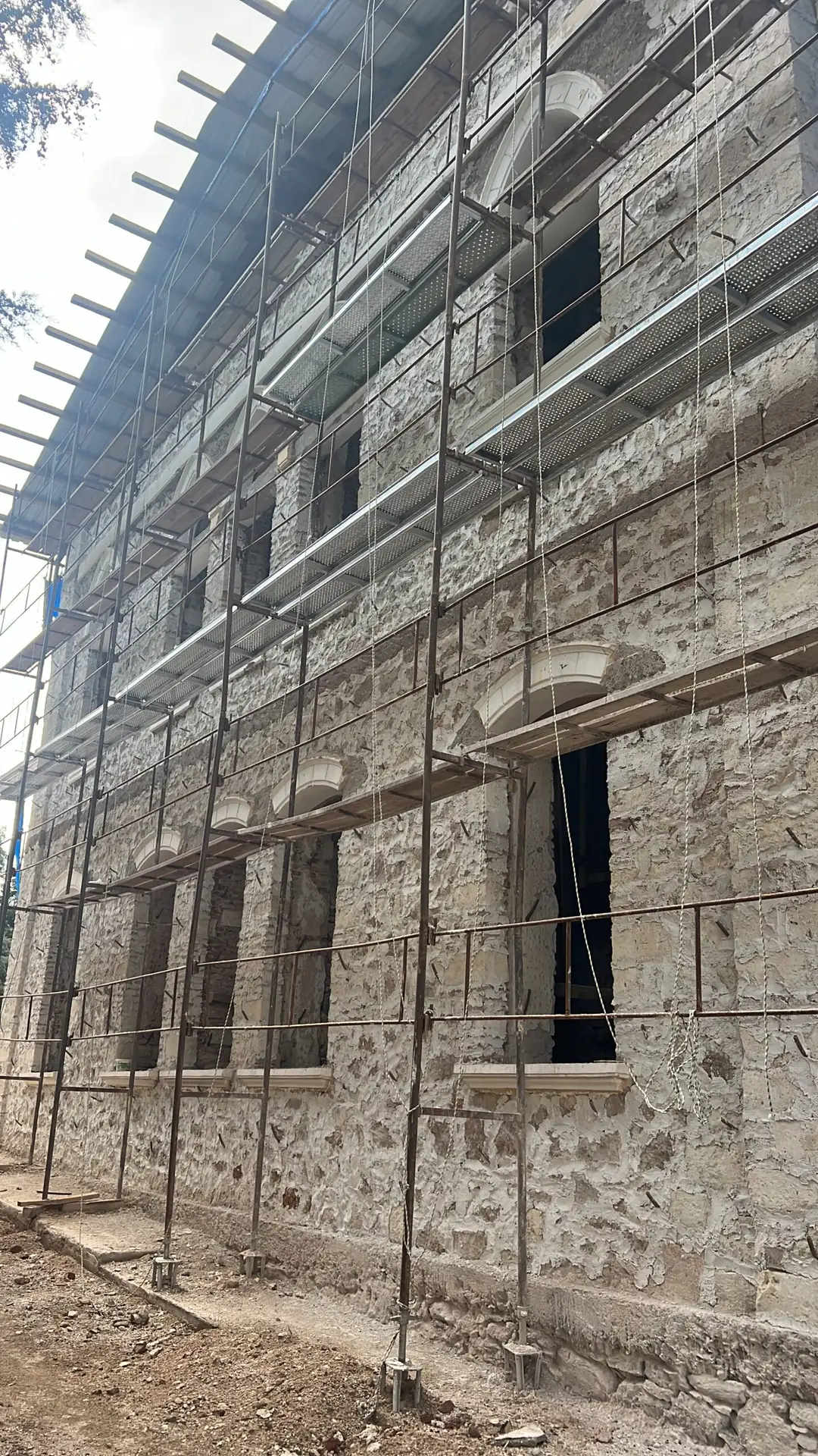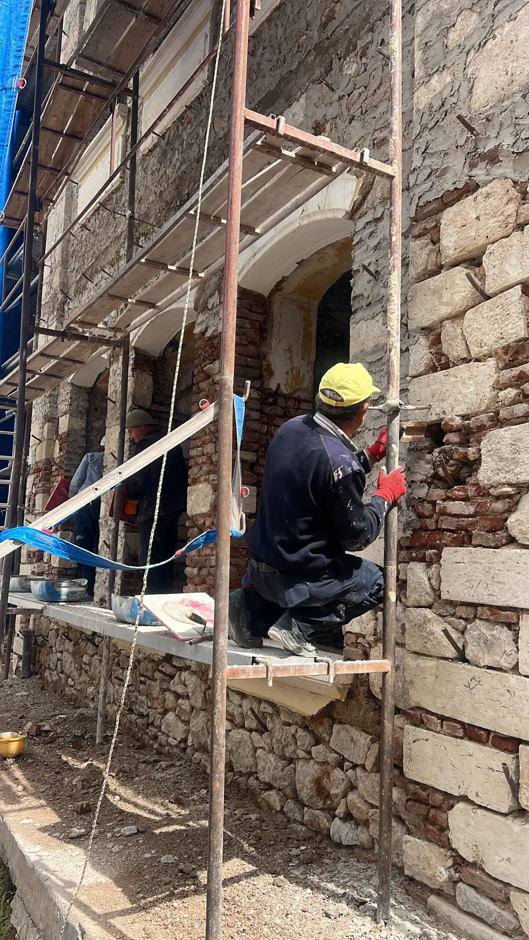Ardından, paslanmaz lama demirlerle dikiş sistemi uygulanarak duvar köşe birleşimleri güçlendirilmiş, ek olarak çelik mesh ve rabitz tel uygulamaları ile yüzey stabilitesi desteklenmiştir. Yapının korunması amacıyla geçici bir çelik çatı kurulmuş, sonrasında ise özgün formuna uygun şekilde makaslı ahşap oturtma çatı sistemi inşa edilmiştir. Tüm duvar yüzeylerine geleneksel teknikle dolgu sıvası, kaba ve ince sıva uygulamaları gerçekleştirilerek yapı hem statik hem estetik olarak bütünleştirilmiştir.