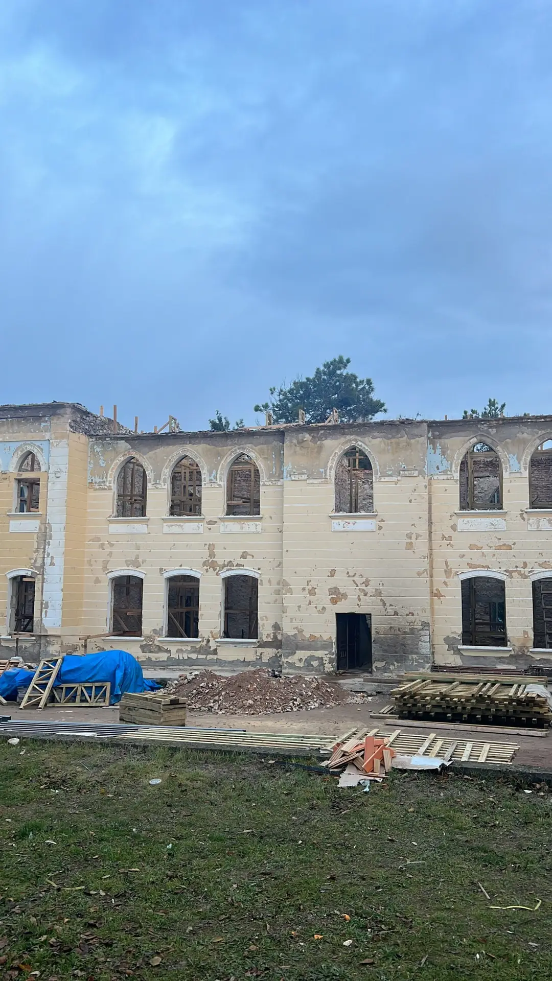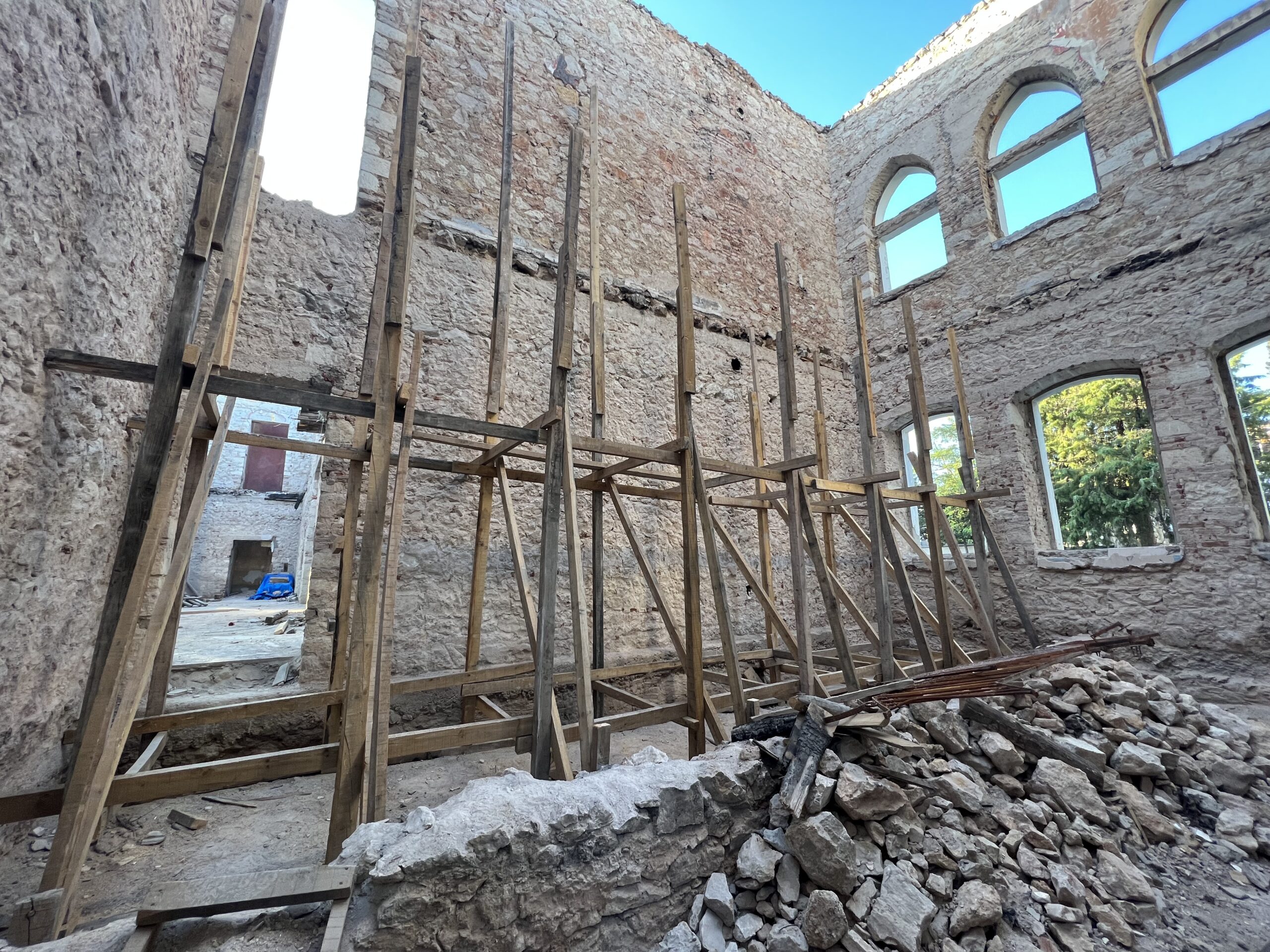 Yangın sonrası tamamen tahrip olan Gazi Paşa Mektebi’nin restorasyon süreci, yapıdaki yangın kalıntılarının ve zarar görmüş tüm ahşap elemanların temizlenmesiyle başlamıştır. Yapıdaki sıvalar raspalanarak tüm beden duvarları açığa çıkarılmış, taş duvarlardaki derzler titizlikle temizlenmiştir. Yapının mevcut durum analizi sonucunda taşıyıcı duvarların yetersiz olduğu belirlenmiş, bu doğrultuda özel enjeksiyon şerbeti ile boşluklar doldurularak duvar içi bütünlük sağlanmıştır.